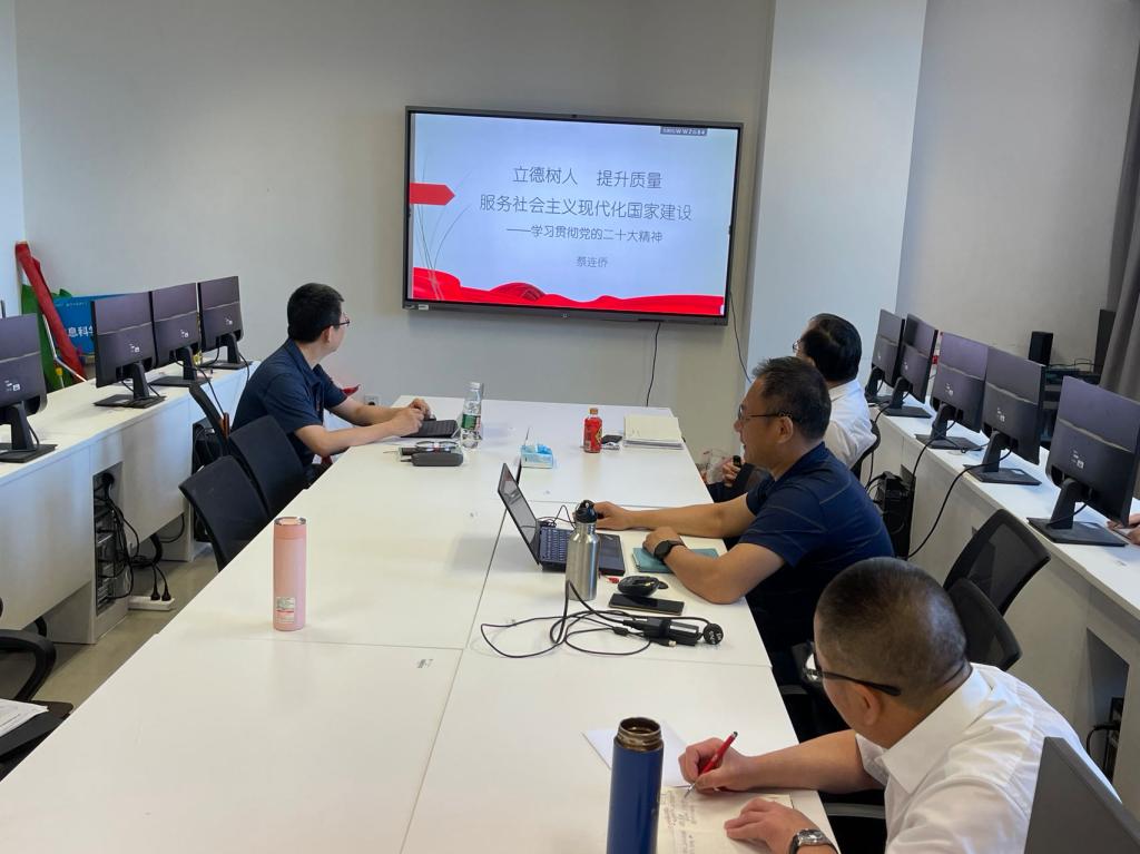 首先由经理蔡连侨讲授了主题为“立德树人 提升质量 服务社会主义现代化国家建设-学习贯彻党的二十大精神”的党课。蔡连侨首先带领大家回顾了二十大报告的主要内容,特别就其中实施科技兴国战略,强化现代化建设人才支撑部分做重点解读。教育、科技、人才是全面建设社会主义现代化国家的基础性、战略性支撑,必须坚持科技是第一生产力、人才是第一资源、创新是第一驱动力,深入实施科技兴国战略、人才强国战略、创新驱动战略,开辟发展新领域新赛道,不断塑造发展新动能新优势。然后结合公司发展目标、学科专业特点以及教师员工工作等方面就如何办好人民满意的教育、完善科技创新体系、加快实施创新驱动发展战略、深入实施人才强国战略做了深入阐述。